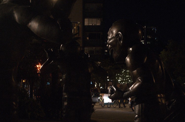 These laughing statues always creeped me out. I didn't think it was possible, but they're creepier at night. You can find them at the corner of Denman Street and Davie Street, just steps from the seawall.